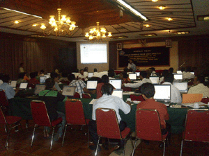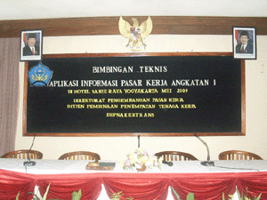 Departemen Tenaga Kerja Sewa Laptop di Hotel Sahid Raya Yogyakarta Foto backdrop rental laptop diambil sebelum acara dimulai. Sewa Notebook oleh Direktorat Pengembangan Pasar Kerja Direktorat Jenderal Pembinaan Penempatan Tenaga Kerja DEPNAKERTRANS Sewa Laptop di Yogyakarta untuk pelatihan aplikasi informasi pasar kerja.